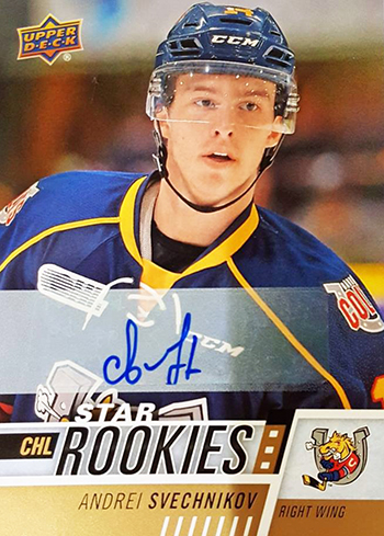 Looking toward the future, the team that built the checklist for the set scouted out some of the brightest CHL prospects heading into future NHL Entry Drafts. The Class of 2019 already has some young stars on the rise and collectors should get acquainted with them now. Arthur Kaliyev of the Hamilton Bulldogs is a goal-scoring machine that lit the lamp 31 times during the regular season and was second among OHL rookies in that category behind Svechnikov. Raphael Lavoie also scored 30 for the Halifax Mooseheads and his stock could continue to rise next season. Other 2019 eligibles that you may want to set aside as you pull their Star Rookies subset cards now include Ryan Suzuki, Bowen Bryam, Blake Murray, Peyton Krebs, Dylan Cozens, Jakob Pelletier, Kirby Dach, and Nolan Foote.