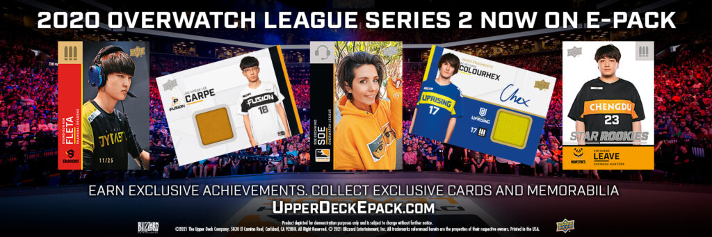 Upper Deck’s 2020 Overwatch League™ Series 2 Trading Cards capture the end of the 2019 season through to the beginning of the 2020 season. You will now be able to collect more autograph cards (solo, duo, trio and even quad), as well as memorabilia cards (solo, duo, trio, 3rd, patch, inked, and fragment relics). Don’t forget about the exclusive achievements available through Upper Deck e-Pack! You can go to UpperDeckEpack.com to find the list for esports.