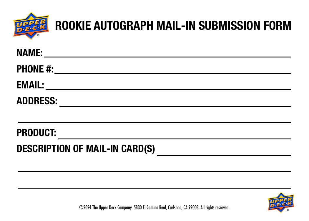 In order to participate in this program, Collectors must mail to Upper Deck both (a) the Mail-In Card and (b) the completed Rookie Autograph Mail-In Submission Form below, during the Mail-In Period to the following address: