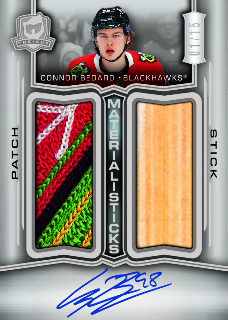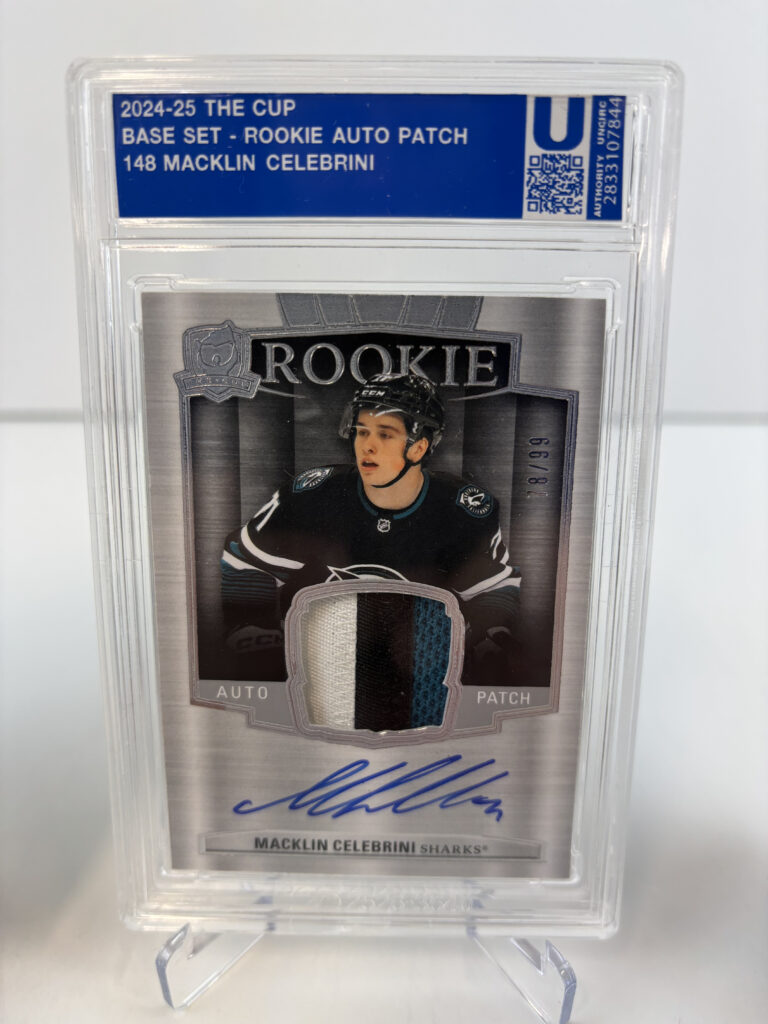 Each tin of 2024-25 Upper Deck The Cup Hockey includes one Rookie Auto Patch trading card encapsulated in an Authority slab. This feature allows collectors to verify their Rookie Auto Patch cards are authentic, uncirculated, and have not been tampered with via patch swapping.