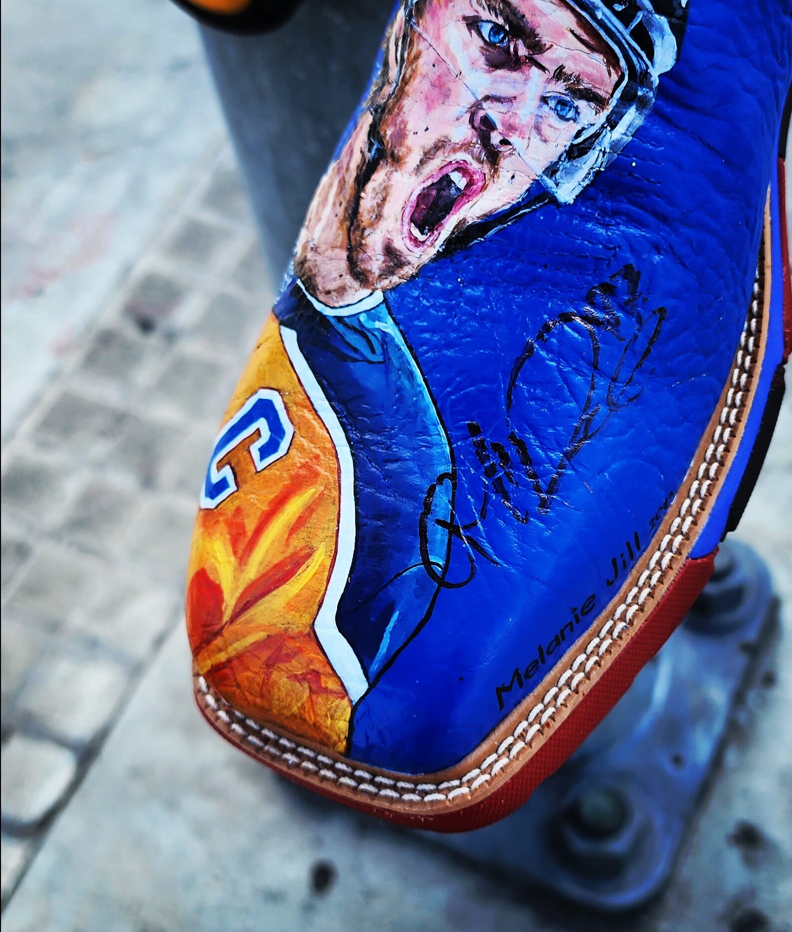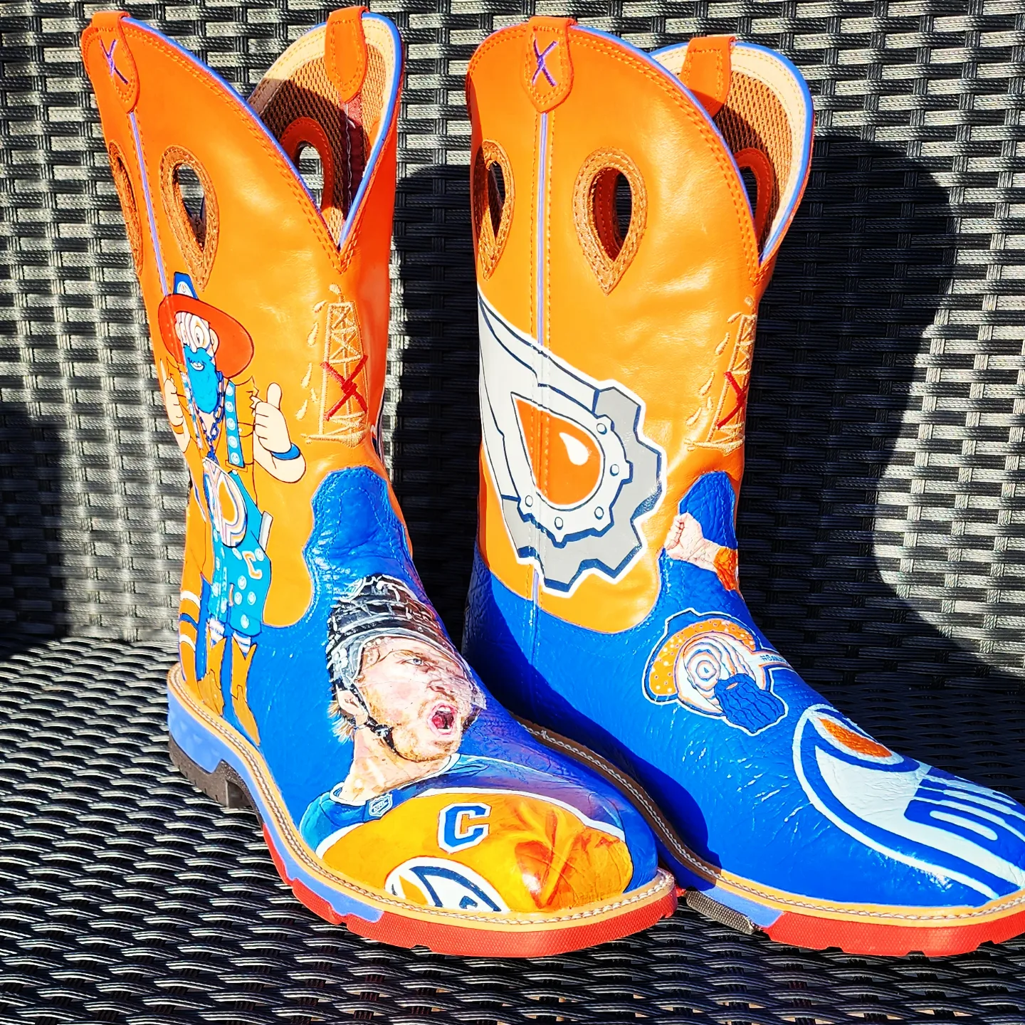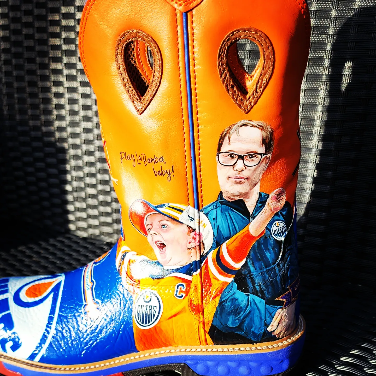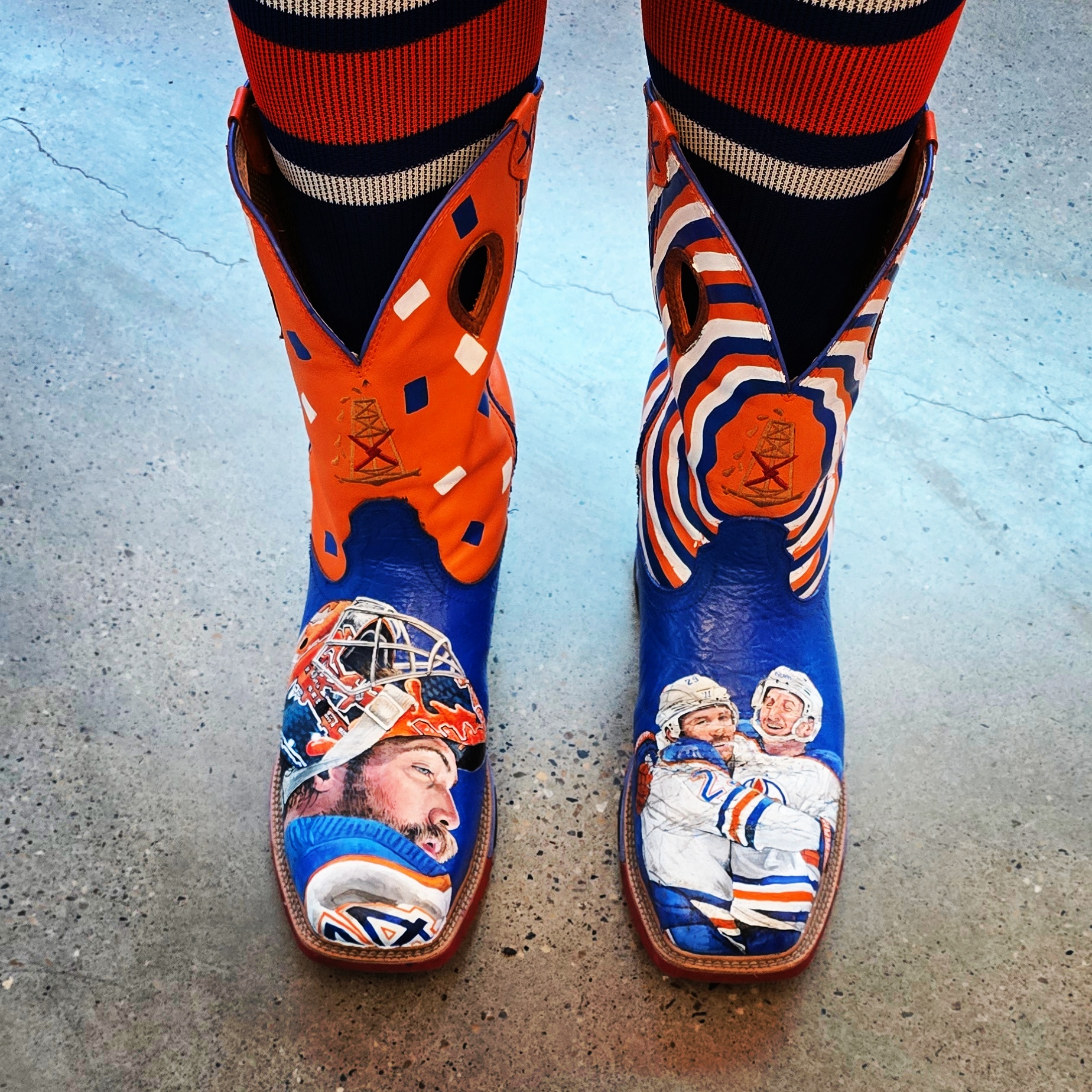 “I have 2 pairs of custom Cowboy boots. Each pair was hand-painted by my friend and local artist Melanie Jill. Each boot has a unique look including Oiler stars Connor McDavid (which I got hand-signed in LA before a game in the 2023 playoffs), Leon Draisaitl and Zach Hyman and Stuart Skinner. As well as Oilers Legends Joey Moss and Ben Stelter. I often catch myself feeling sorry for wearing them out to games, but they are too cool not to wear and show everyone the amazing artwork!”