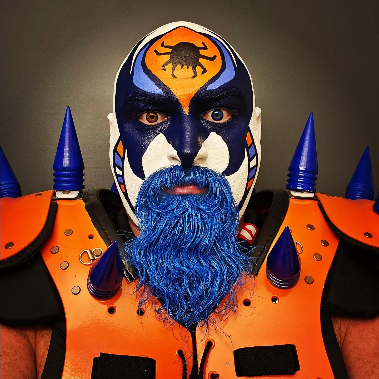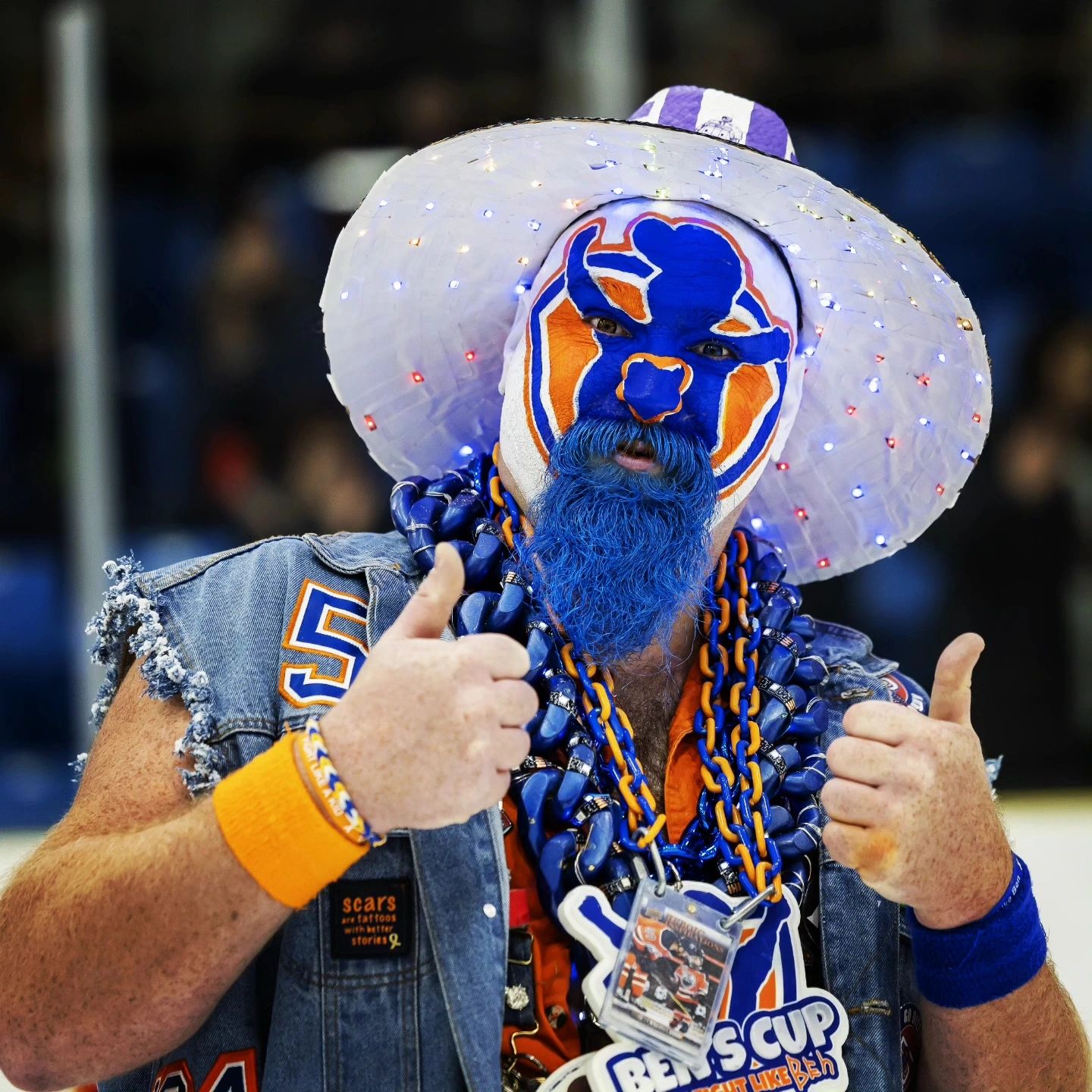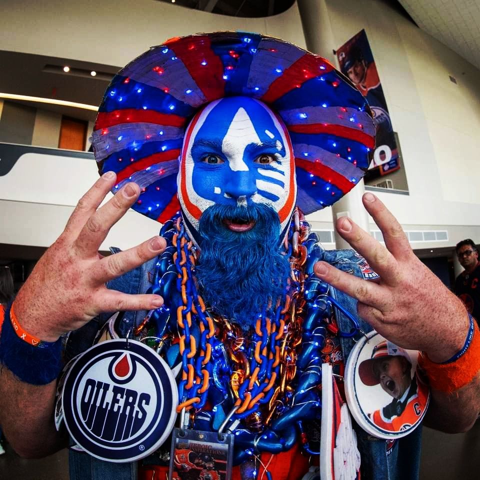 “Having now painted over 140 different faces I’m definitely running out of ideas slowly. Each face paint takes anywhere from 1.5 to 3 hours depending on the level of detail. I paint all of my own faces in a mirror with some brushes and a steady hand. I usually look to some sort of theme dependent on who the Oilers are playing that night. Oil drop designs, old school wrestling faces, Marvel characters, different variations of my “Original” face paint design and special theme nights. People also ask how I get it off and it really isn’t too crazy, blue dish soap helps get the paint and beard dye out after a night at the rink. The key is to moisturize! [laughs] It’s crazy to see how much more face paint has been showing up at the rink since I have started painting and being spotted on TV. Orange and Blue were sold out in Edmonton this past playoff run. I’ve got enough stock for another deep playoff run this year.”