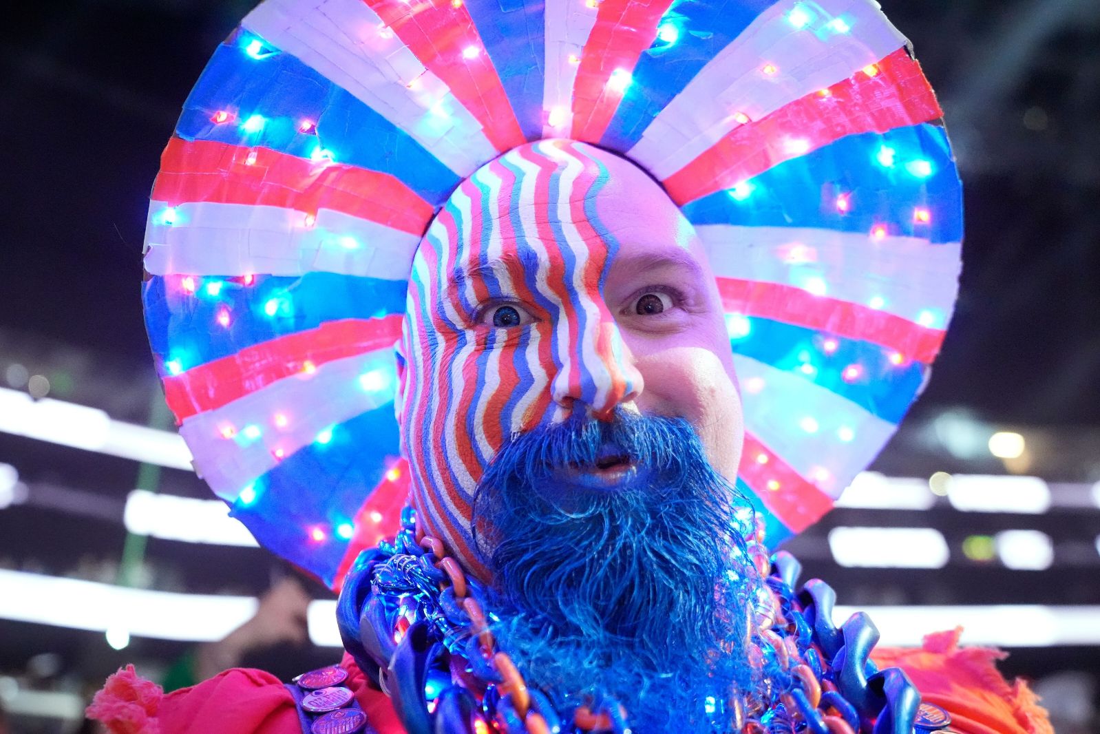 “My hats started their journey on a beach in Mexico. My fleet of hats has expanded to 6 different variations, all hand painted and having their each uniquely different look. LED lights and duct tape under the brims help my look, and really stand out when the lights are off. Easy to spot Banjoguy in the stands pregame and during the anthems blinking away.”