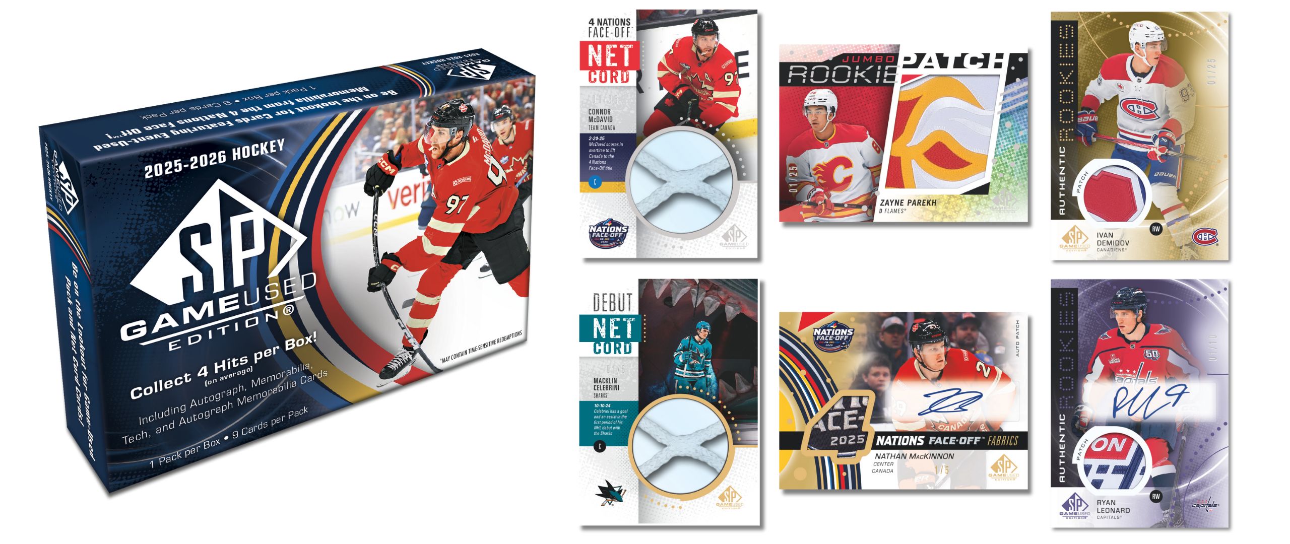 SP Game Used Hockey is back with an abundance of event and game-used memorabilia! Look for cards featuring jersey, banner, net cord and/or puck material from the NHL Stanley Cup Playoffs, NHL Global Series, NHL Stadium Series, and the 4 Nations Face-Off. This set also features game-used jersey swatches, patches and other unique memorabilia pieces.