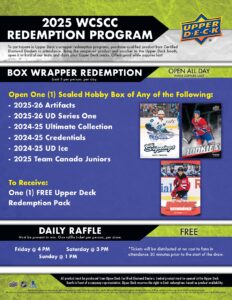 Upper Deck is excited to have collectors and sports enthusiasts join us for this year’s Western Canada Sports Collectors Convention, taking place in Langley, BC from Friday, November 14 – Sunday, November 16. Participate in Upper Deck’s ever-popular Wrapper Redemption Program that will be ‘live’ at the show! See below for more information.
