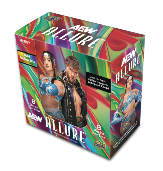 AEW Allure® returns to the ring with a 100-card Base Set featuring 80 top wrestlers from the AEW universe and a 20-card In Action Base Set cards fall four (4) per pack, on average, and the In Action subset cards fall one (1) per pack on average. The parallel lineup is stunning and diverse. From color and pattern variations to autographs, AEW Allure® appeals to a wide variety of collectors, especially auto, wrestler, and set collectors. Collect one (1) Black Rainbow, Red Pulsar or Orange Slice parallel card from every pack, on average!