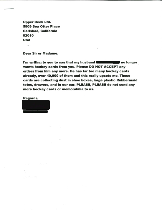 At our core, guys can be a little stupid and women can be a little crazy. As this letter demonstrates, the husband was a little stupid for continuing to purchase cards, redeem items and for bringing in new memorabilia items that he knew his wife would hate. And in turn, she was a little crazy for writing a company blindly and telling us not to support our customer.