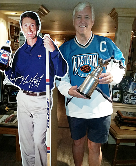 But over time, that kid’s trophy case started to fill with Oilers, Kings, Blues, Rangers, Team Canada, and NHL All-Star awards of every kind. Additionally, there were game-worn jerseys, sticks, and pucks everywhere. Only they were not just there for viewing. Walter INSISTED you put them on and take pictures with your favorites. His only rule is that you stood where he wanted you to stand, posed with what he wanted you to pose with, and DON’T CUT OUT THE LEGS! Yes, Walter is a director at heart. While most of the record-breaking jerseys, sticks, and pucks are on loan to the Hockey Hall of Fame and like venues, Wayne’s roots remain in the family home with his dad.