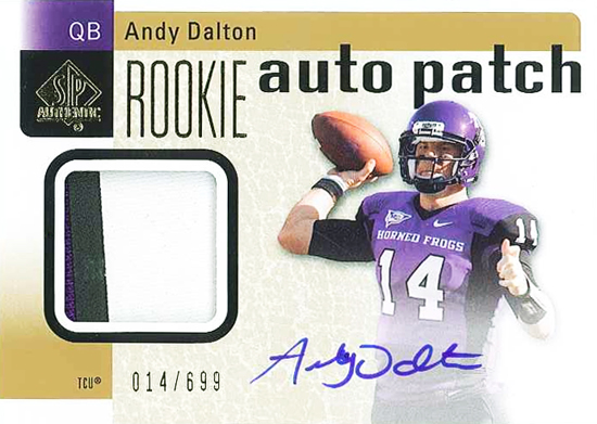 Upper Deck’s 2011 SP Authentic Football will hit store shelves in a couple weeks and will be loaded with predominantly hard-signed autograph content of top football rookies. The set collectors love to chase are the autographed patch rookie cards and two rookies that are sure to be in high demand are Cam Newton and Andy Dalton. We were able to grab a couple images of their 2011 SP Authentic Autographed Rookie Patch cards to help create some excitement for the upcoming launch of the product set to arrive on November 22.