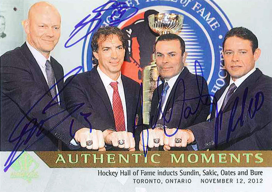 Upper Deck’s “Authentic Moments” insert set in NHL® SP Authentic has become a favorite with fans for capturing some very compelling moments on and off the ice. Fans also love that there are hard-signed autograph parallels of many of the cards including multi-signed cards. We were pretty excited when Adam Oates returned this card also signed by Mats Sundin, Pavel Bure and Joe Sakic who were inducted together into the Hockey Hall-of-Fame in November of 2012.