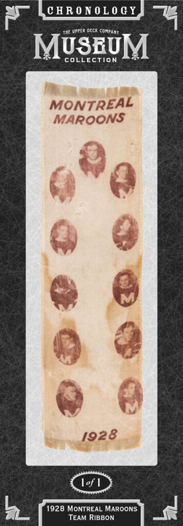 1928 Montreal Maroons Team Ribbon – The National Hockey League was just entering its second decade as the premier league in the world when this extremely rare silk ribbon featuring eleven members of the 1928-29 Montreal Maroons went into circulation. The franchise only existed from 1924-38, but its NHL lifespan was as successful as it was brief. During its 14-season run, the Maroons reached the playoffs 11 times, reaching the semifinals an impressive eight times and winning two Stanley Cups!