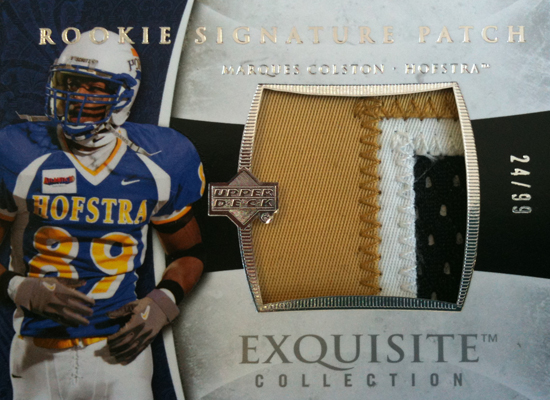 For Upper Deck’s new exclusive CLC releases we have been on the hunt for game-used memorabilia of players from their college days. Recently we worked with Colston himself to acquire a very unique game-used jersey from his days at Hofstra. There are several things that make this particular jersey unique. First it is one of only two jerseys that Colston wore during the 2001 season at Hofstra. In fact, we’ve found collegiate game-used items are often more rare than pro memorabilia.
