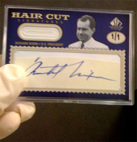 You know the drill by now. I’m sitting at my desk, minding my own business, and I get a call about the latest goodies we have in house. So I walk on over to the vaults and what do I see? The Presidential Hair Cut Signature cards from SP Legendary Cuts. These cards feature a cut signature from the historical figure, along with a strand of their hair. Unreal.