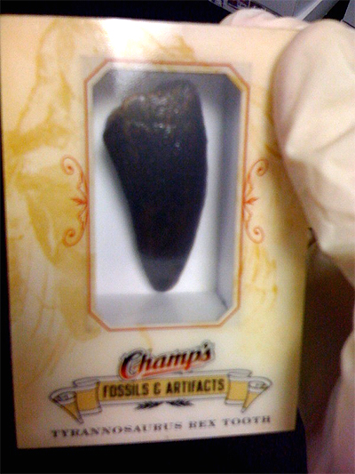 One of the cooler items I’ve seen with the Brag Photo of the Week was the collection of dinosaur bones that came with the 2008-2009 Champs Hockey set. It was back in May that I held one of the fossils myself (not to mention a full spread of the dinosaur bone cards), but today I was made aware that the big one is still here: the Tyrannosaurus Rex tooth.