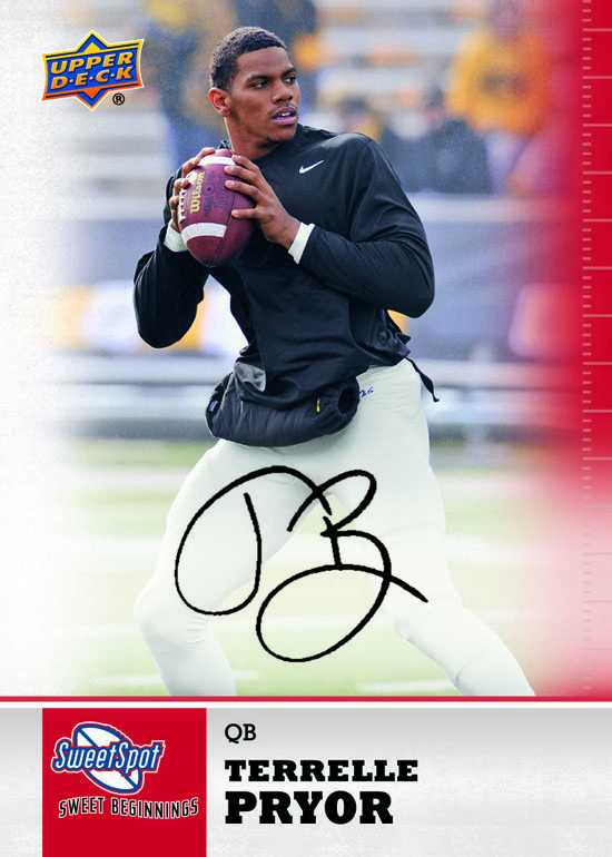 Upper Deck’s new 2011 NCAA Sweet Spot Football set is out live today for collectors to enjoy. Behind the scenes, Upper Deck staffers were busy making moves to get all the top rookies in the set. That includes Terrelle Pryor who is currently in “football limbo” where it is uncertain whether or not he will have to opportunity to play in the NFL this season. Upper Deck was able to secure a deal with Pryor for image rights and even autographs. Collectors can find his short-printed “Sweet Beginnings” rookie card (#101) and even rare “Sweet Beginnings” autograph rookie card in 2011 NCAA Sweet Spot Football.