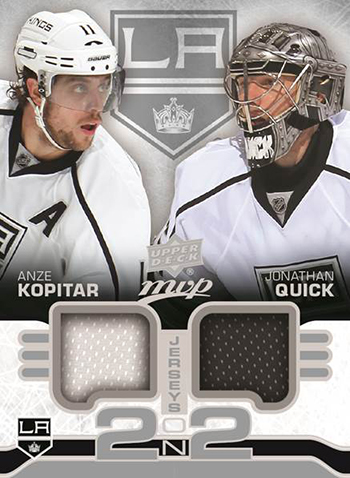 That being said, it is interesting that one of the cards Upper Deck mocked up to show off to fans what the set would look like actually has a tie to the current NHL® Stanley Cup Playoffs. The 2-on-2 jersey cards found in the product will feature four total swatches of game-used jersey material embedded in the card. On one side will be two star players from one team and on the other side will be two star players from a rival team. On the eve of the beginning of the series between the Los Angeles Kings and the Anaheim Ducks, we thought fans would like to take a look at this card.