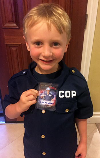 I was excited when I first heard about the 2018 Goodwin Champions Genuine Heroes cards because there was a police officer in the set. He had been asking me, “Dad, why doesn’t Upper Deck make police cards?” And now I had one for him. These cards are randomly inserted into packs of 2018 Goodwin Champions and can be a little hard to find. Since I was looking for something specific, I made my purchase just like many of you would on eBay and his card arrived this week at long last. He was all smiles upon receiving it and has been carrying it around with him showing it to all his friends. Take that Pokemon!