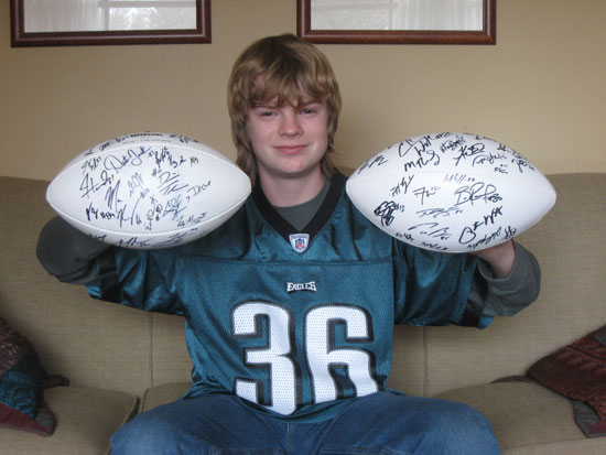 I first met Richie when I started working at Upper Deck almost three years ago. He was one of our Kid Bloggers and Moderators on Upper Deck Kids. To say the least, Richie was the pulse of the kids site, and provided valuable insight into what his fellow kid collectors were looking for from Upper Deck. Besides being one of our largest young collectors, Richie had the UDK points to prove it. By entering his Upper Deck card codes, he gained points that he could use to get various Upper Deck products, as well as other fun entertainment items like video games and iPods. Two such items Richie added to his collection are NFL Rookie Photo Shoot autographed footballs from 2008 and 2009, which are two of his most prized possessions, “Rookie autographed footballs are great because they feature some terrific young stars and it is fun to see which players turn out to be the real deal”.