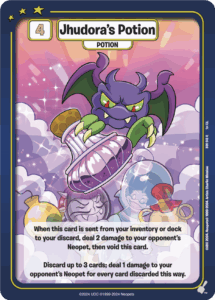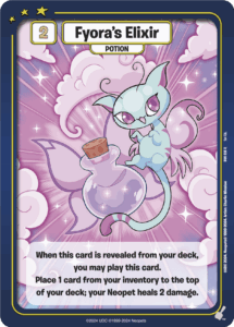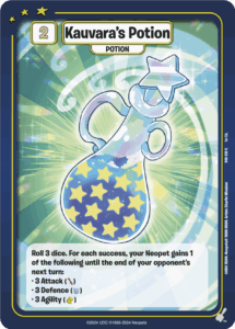 As the game carries on and battling gets more complex, it’s always good to have an extra quick trick ready to give you that edge towards victory. The second to last card type from Defenders of Neopia we are previewing today is Potion! These cards are like Legends in that they are discarded after use and have unique abilities that match the various archetypes you will find. Sometimes they’ll have you roll dice and do certain things based on the results, other times they will play into a more complex strategy like the ones found on Fyora and Jhudora.