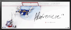 A few weeks after the Young Guns card was released, Lafrenière made his NHL debut against the New York Islanders on January 14, 2021. Two weeks later, he scored his first career goal to secure an overtime victory over the Buffalo Sabres, and that moment is captured perfectly in a signed piece from Upper Deck Authenticated dubbed “The Show 1st Goal”.