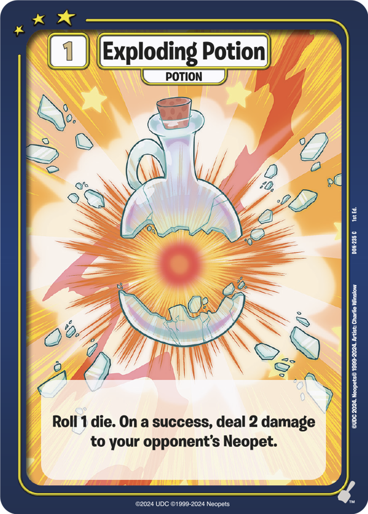 Roll Dice! – Both players have gathered their attack and defence dice… let’s roll! Both players will roll their dice simultaneously and compare the results. For the attacking Neopet, dice results of 1, 2, or 3 are failed attacks, dice results of 4 or 5 are successful attacks, and dice results of 6 are critical attacks. Critical attacks are successes that cannot be blocked!