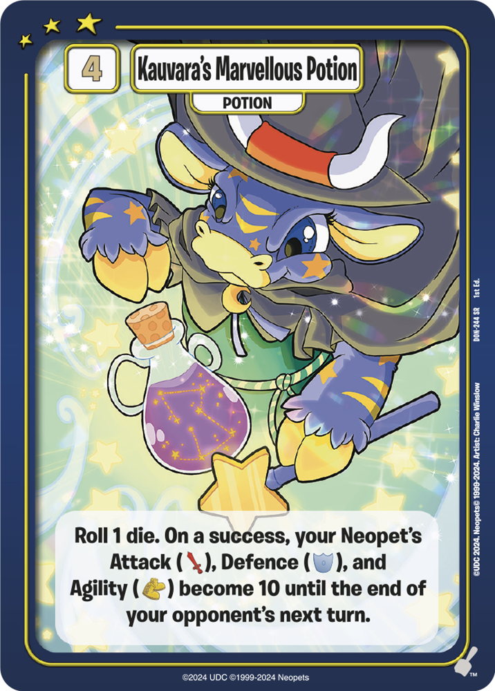We have Drawn and Trained, it’s now time to Prepare. During your Prep phase you may play one card from your inventory with a level requirement equal to or less than your Neopets level. In Defenders of Neopia, this includes Paint Brushes, Faeries, Legends, Equipment, and Potions. So, if your Neopet is Level 3 (has 3 Codestones attached) you can play any one card from your hand with a level requirement of 3 or less. Here are a couple of cards you might want to play on your first turn after attaching a Codestone: