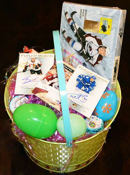 Some creative sports fans who celebrate Easter are getting creative with their gift giving this season. Recently we saw a couple great images of Easter Baskets we really loved where Upper Deck packs and were cards were used. The first one is for a younger collector who loves NHL® hockey cards and it came out really nice.
