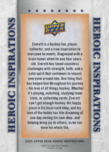 Everett Misenas is a staple in the collecting community in Edmonton. You can usually find him at Wayne’s Sports Cards & Collectibles – his happy place. For years Everett has loved all things hockey – playing, watching, learning about team and player stats, and of course collecting hockey cards. In fact, his dream is to one day own his own hobby shop, and help bring the joy he finds in collecting to others. So when Upper Deck heard about Everett’s story, we knew we wanted to honor him as part of our Heroic Inspirations program.