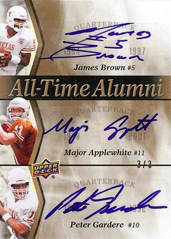 “When Upper Deck came out with the University of Texas Longhorns Football card set I was ecstatic. I finally had a solution to allow my to continue my love for collecting without taking up more space in the house. I am still about 25 cards short from the full master set (mostly the rarer /3 and /5 cards duo and trio autographs) and am always searching various websites and attending sports memorabilia shows to find them.
