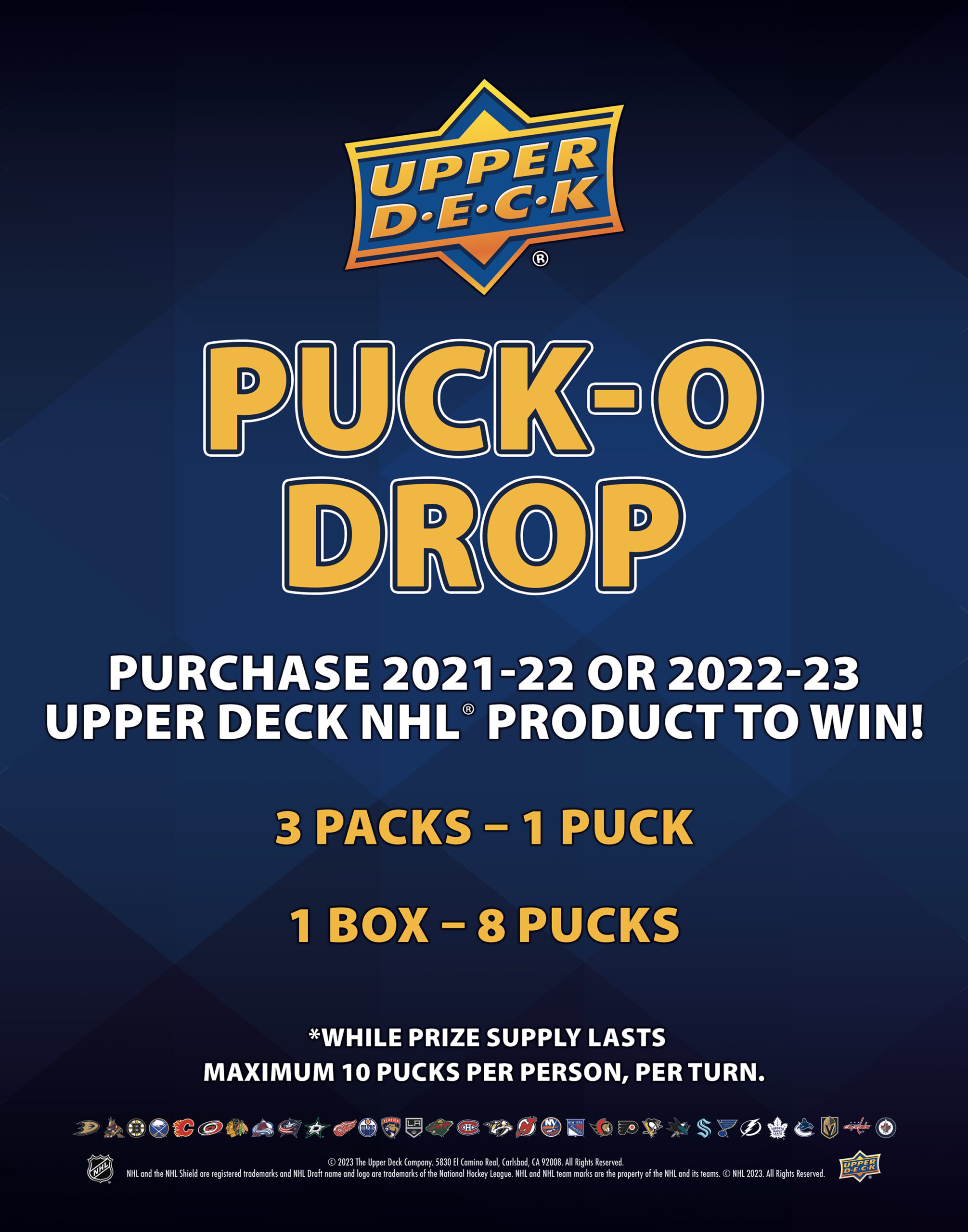 For more chances to win, you can purchase an Upper Deck Hobby box and get to drop EIGHT pucks on the board! There will be Certified Diamond Dealer shops present to help fulfill all your hockey card desires!
