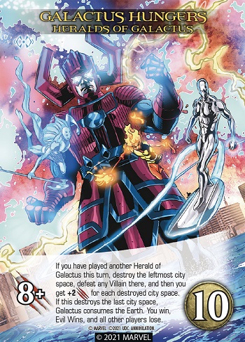 Two Galactus cards in this set can destroy city spaces. If a city space like the Rooftops is destroyed, act as if that city space no longer exists. If the city is ever completely destroyed the game is over! Galactus has consumed the Earth and evil (and possibly you) wins!