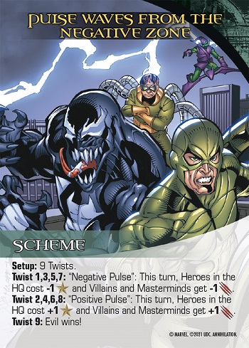 It was from the Negative Zone that Annihilus begins his systematic destruction of the galaxy. This literally begins a war of survival between the Positive, the Milky Way Galaxy and the negative, the Negative Zone. But who will prevail? The Heroes must learn to strike when an opportunity presents itself. Will you be able to overcome Annihilus and his seemingly unstoppable wave of destruction before it is too late? With this scheme timing is everything.