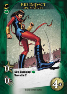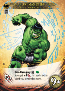 The first keyword is another returning keyword. Size-Changing is a fun return from Legendary®: Civil War that modifies the cost of heroes. Size-Changing is always accompanied by a class icon and allows players to reduce the cost of that Hero by 2 Recruit if they played a card of that class earlier that turn. Part of bringing these keywords back is a question of how to keep making them fun and engaging. So what are we doing with Size-Changing to keep it fresh? Well… I’d like to introduce you to my friend Totally Awesome Hulk who has two different icons for Size-Changing. Why is that cool? Because you can get a larger discount by playing both classes.