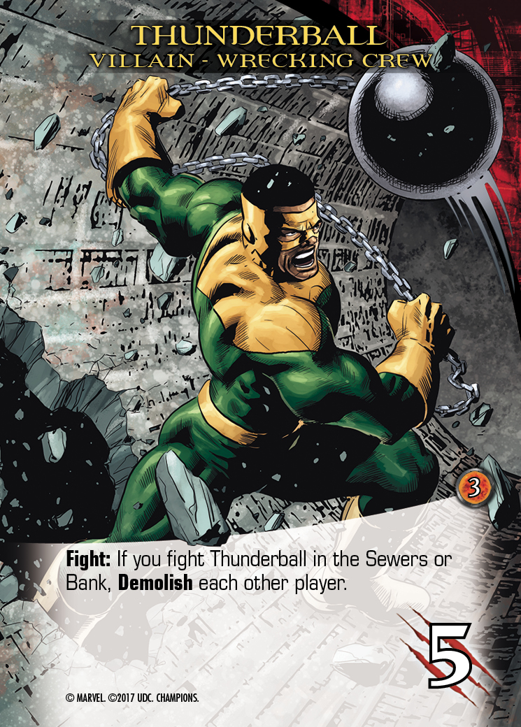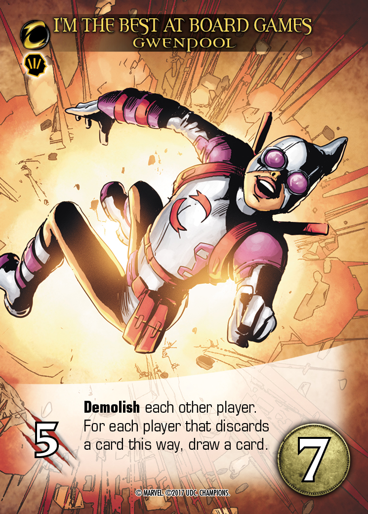 The other keyword we’re going to look at is Demolish, which is both new and returning. Demolish has been seen before in Legendary®: Villains but this will be its first time inserted in the classic Legendary®: A Marvel Deck Building Game. Demolish causes players to discard from their hand. When a card instructs you to Demolish, you reveal the top card of the Hero Deck, put it on the bottom and then everyone must discard a card with a cost matching the revealed card. Normally, this would come on Villain cards – and it would be a sort of attack from the villains and Mastermind to hinder the progress of the players. But the Champions have Gwenpool…