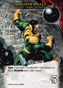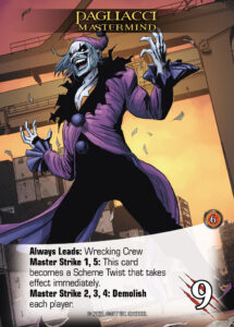 Now we have a look at the first Villain Group! The Wrecking Crew specialize in Demolish, and rightly so. The Wrecking Crew wants to get in your way by cutting your hand down. But they’re not the only ones you need to be afraid of. The first big villain the Champions took down was Pagliacci, and he brings some interesting dynamics to being a Mastermind, by always coming with a plan to improve his scheme!