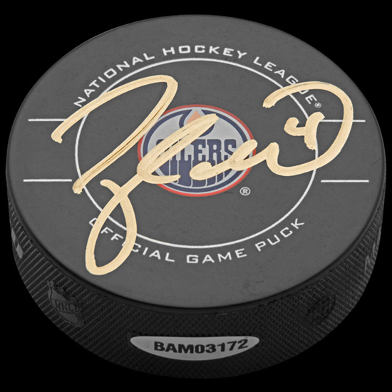 Hockey sensation Taylor Hall is 6′ 1″ tall and weighs 190 pounds. He’s also the No. 1 overall pick from last June’s NHL Entry Draft, selected by the Edmonton Oilers. Much hype surrounded Hall’s No. 1 classification and so far this season, he’s living up to the billing. The burly 19-year-old center has already tallied nine goals and six assists for the Oilers, who are currently battling for the top spot in the Western Conference’s Northwest Division. Get in on the ground floor of Hall’s surefire professional hockey career by landing this autographed puck from Upper Deck Authenticated signed by the standout young gun during September’s NHLPA Rookie Showcase, which was held in Toronto. Come to think of it, he just scored the game-winning goal in Saturday night’s 2-1 overtime victory against St. Louis, so what are you waiting for? Place your order today!