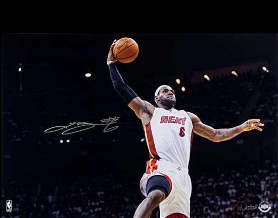 LeBron James has helped lead the Miami Heat to eight straight wins by double digit margins of victory. To say the Heat are hot is an understatement. Everyone has been waiting for this team to gel and it seems like they are doing just that. Capture the two-time NBA MVP with Upper Deck Authenticated’s new “Glide Dunk” signed photograph.