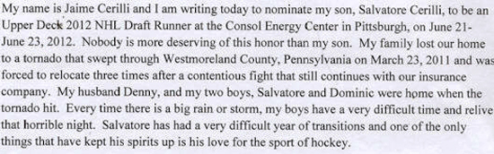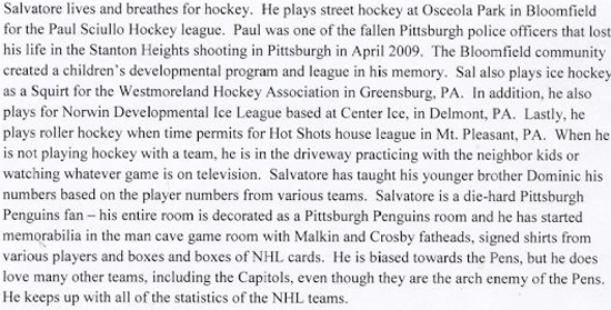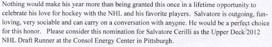 In an effort to engage younger collectors and hockey fans, Upper Deck recently announced a promotion where one lucky fan could win the opportunity to serve as Upper Deck’s NHL Draft Runner at the 2012 NHL Draft. Participants needed to send in an essay as to why they felt they should be Upper Deck’s NHL Draft Runner. Participants could also nominate a kid they felt was deserving of this unique opportunity. And that was what happened with Salvatore Cerilli from North Huntington, PA as his mother sent in the following submission on his behalf.