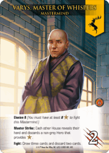 In Legendary®: Game of Thrones™, the Masterminds are the heart of your House, and the battle concludes when all Masterminds have been defeated from a single player, or six in total from across the game. Each House has five Masterminds with strong master strike effects that can swing the fight to your favor. King Robert Baratheon starts with a mighty 12 damage but don’t play strategy cards or he loses power. His Masterstrike grants 1 victory points for each card that has the class of your choice between Strength and Instinct potentially granting you a huge boost in points. His Fight effect for being defeated is the King’s Landing House gains a wound so losing may cause issues moving forward besides losing a Mastermind. Varys, Master of Whispers has the Elusive 8 trait that protects him unless you’ve collected 8 recruit points. His Masterstrike forces other houses to discard non-grey Heroes that provide recruit points robbing your players of growing their deck that hand. The Fight effect for defeating him allows the winner to draw 3 cards and discard two giving a stronger hand for defeating him.