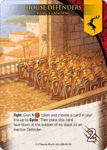 Defenders are a new card type for Legendary: Game of Thrones, every House has them, and they protect your own Masterminds from your enemies. Each player begins with a stack of 5 Defenders with two face down, or inactive and the status of these Defenders will change wildly during gameplay.