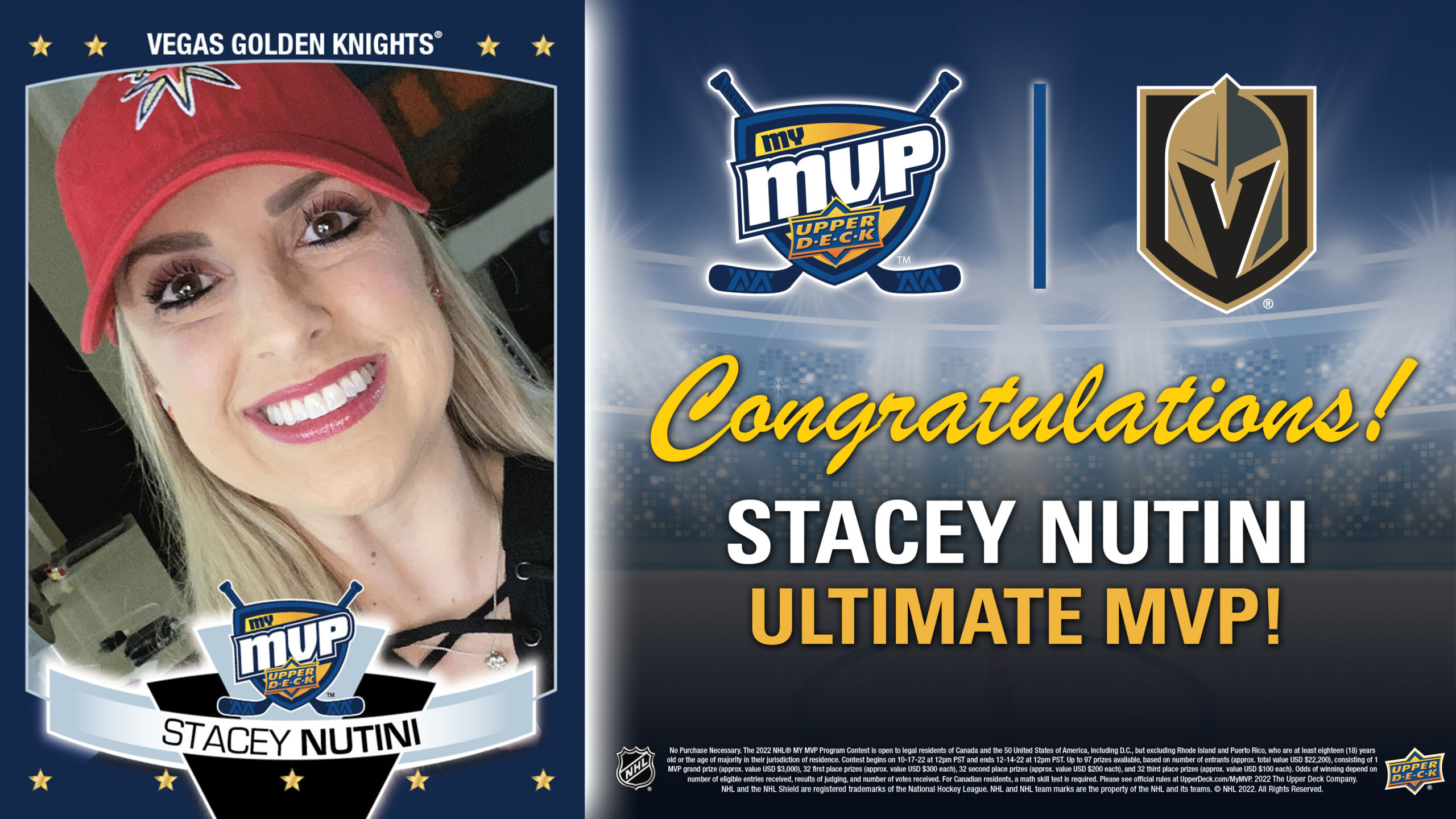 The votes are in! After two, long rounds of public voting, the NHL and Hobby community has spoken. Upper Deck is proud to announce Stacey Nutini as the 2022 Ultimate MVP Winner! With a huge fan base supporting her, Stacey shot right to the top of the rankings from the very beginning. Although she was battling some tough competition from other fans along the way, Stacey held her own and rode her way to the title of Ultimate MVP!