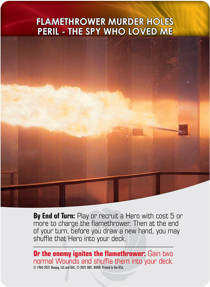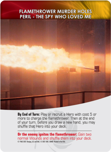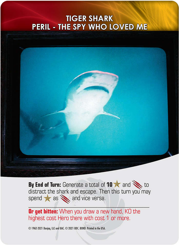 Things aren’t always easy for Bond, and the all-new to Legendary Perils showcase that perfectly. Many of the card groups in The Spy Who Loved Me require you to set up a Peril stack beside the Mastermind. As you play you’ll be instructed to draw these cards, representing traps and scenarios that Bond has been forced into. Be they shark pits or falling stone blocks, they represent unforeseen obstacles that put you in danger!