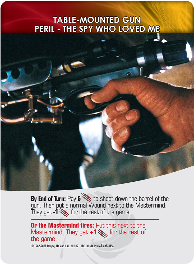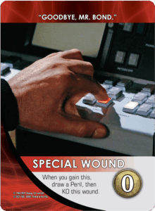 No matter what happens with a Peril, it’ll be KO’d at the end of the turn of the player dealing with it. If you succeed in its challenge you’ll be safe from the Peril’s effect and gain any benefits from your accomplishment. If you should fail, you’ll have to deal with penalties that are different for each potential Peril. Before you draw a new hand, follow the instructions on the card and then KO the Peril. A new, “Goodbye, Mr. Bond” Special Wound is also included in Legendary®: The Spy Who Loved Me, which forces you to draw a Peril immediately!