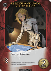 Returning from Legendary®: S.H.I.E.L.D., sending a Hero Undercover means “Put that Hero into your Victory Pile. It’s worth 1 Victory Point.” Some cards allow you to send others Undercover, which is a great way to thin out starting cards or cards that clash with how your deck has come together. Others go Undercover themselves, like Yelena Belova’s “Strike and Fade” card. This would still allow you to use her