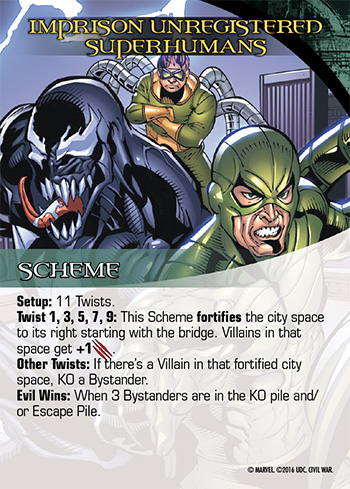 Legendary®: A Marvel™ Deckbuilding Game has always been about the battle. Stacks of cards representing Heroes, Villains, Masterminds, and Bystanders move around the board as the fight between the players and the game plays out. One card stands above all others. Schemes give a story and it dictates what the players will face and how the game can beat them. Legendary®: Civil War is full of these stories.