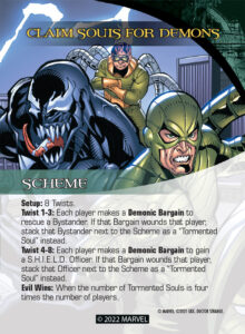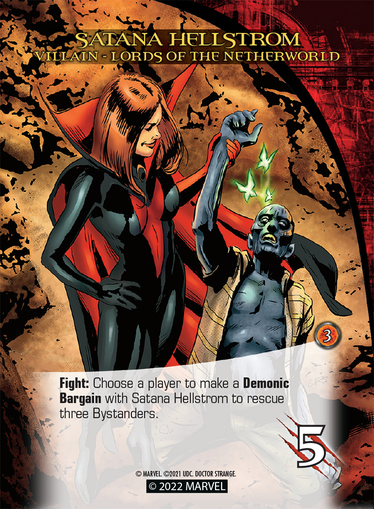 Some Villains say things like “Fight: Choose a player to make a Demonic Bargain with Satana Hellstrom to rescue three Bystanders.”