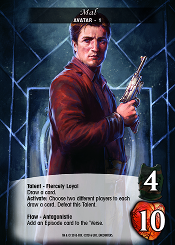 An example of this setup would be: Mal, Kaylee, and Jayne are selected for a three player game. To round out the five Main Characters Inara and Wash are also selected. These two will not be used by players directly. The 14-card decks of the final four Avatars: Book, River, Simon, and Zoe are shuffled together to form the Crew Deck.