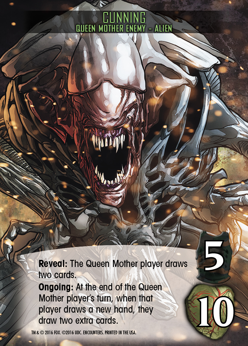 There are four different Queen Mother enemy cards, each describing a different characteristic of her. During setup, one is secretly selected and placed on the bottom of the Hive. Once it’s revealed, it must be fought similarly to an enemy player: You must spend Attack equal to its Defense to force it to draw Strikes.