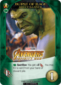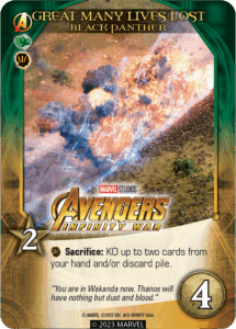 Some Avengers had to make the ultimate sacrifice in the name of defeating Thanos. That commitment, and the weight it carries, comes into play thanks to this keyword. When a card with Sacrifice is played and other conditions are met (such as playing a [Ranged] card first), you may KO that card to use its Sacrifice ability.