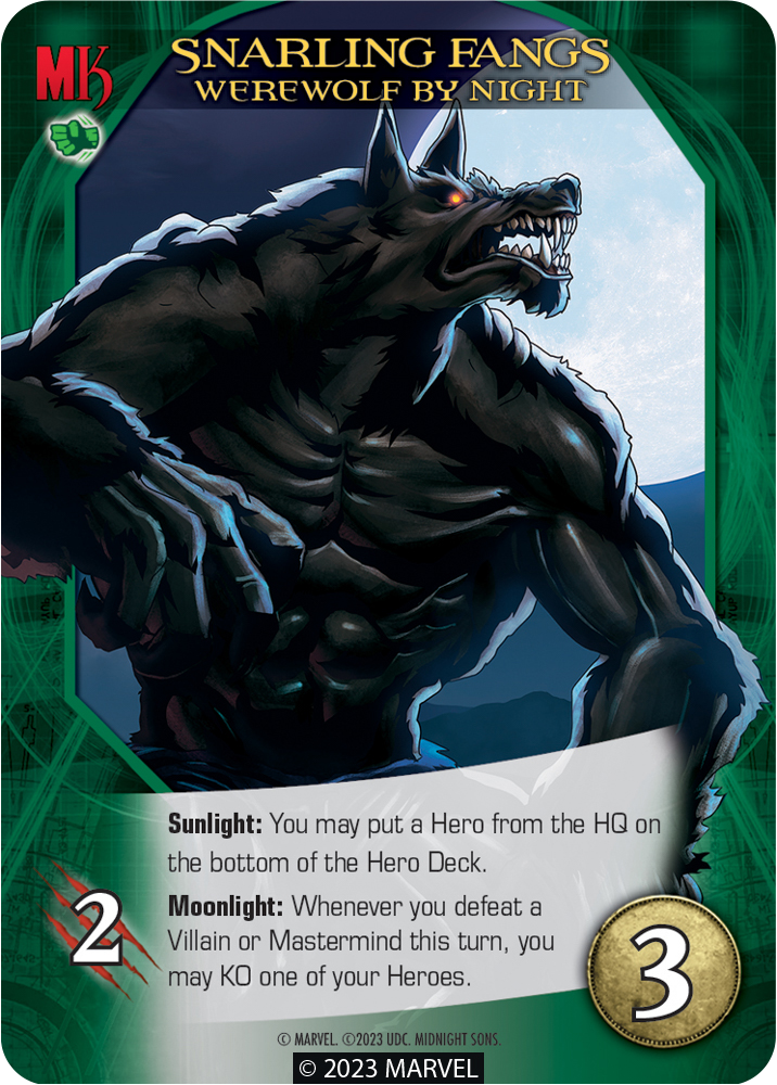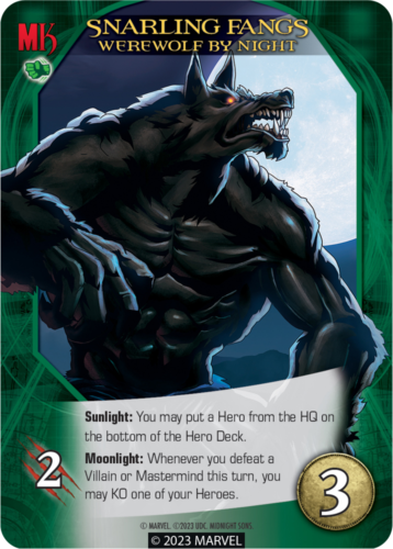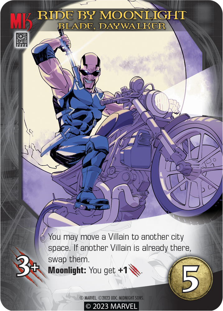 Legendary®: Midnight Sons brings monsters and monster hunters together to oppose more terrifying foes. Such creatures (and some of our Heroes) are only able to unleash their full capabilities at night. These include Blade, the daywalking Dhampir, and Jack Russel, the Werewolf by Night. With their presence, we’re bringing back a keyword that debuted in Legendary®: The New Mutants.